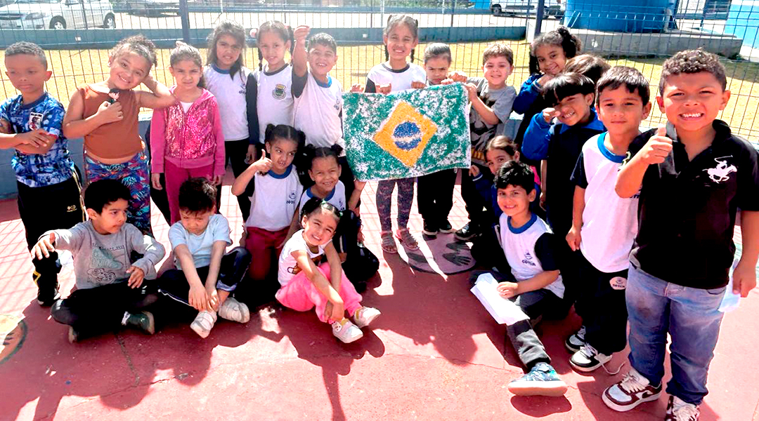 Em um ambiente preparado para valorizar a expressão artística, as crianças usaram tintas, pincéis e papel para dar forma às suas percepções sobre o Brasil